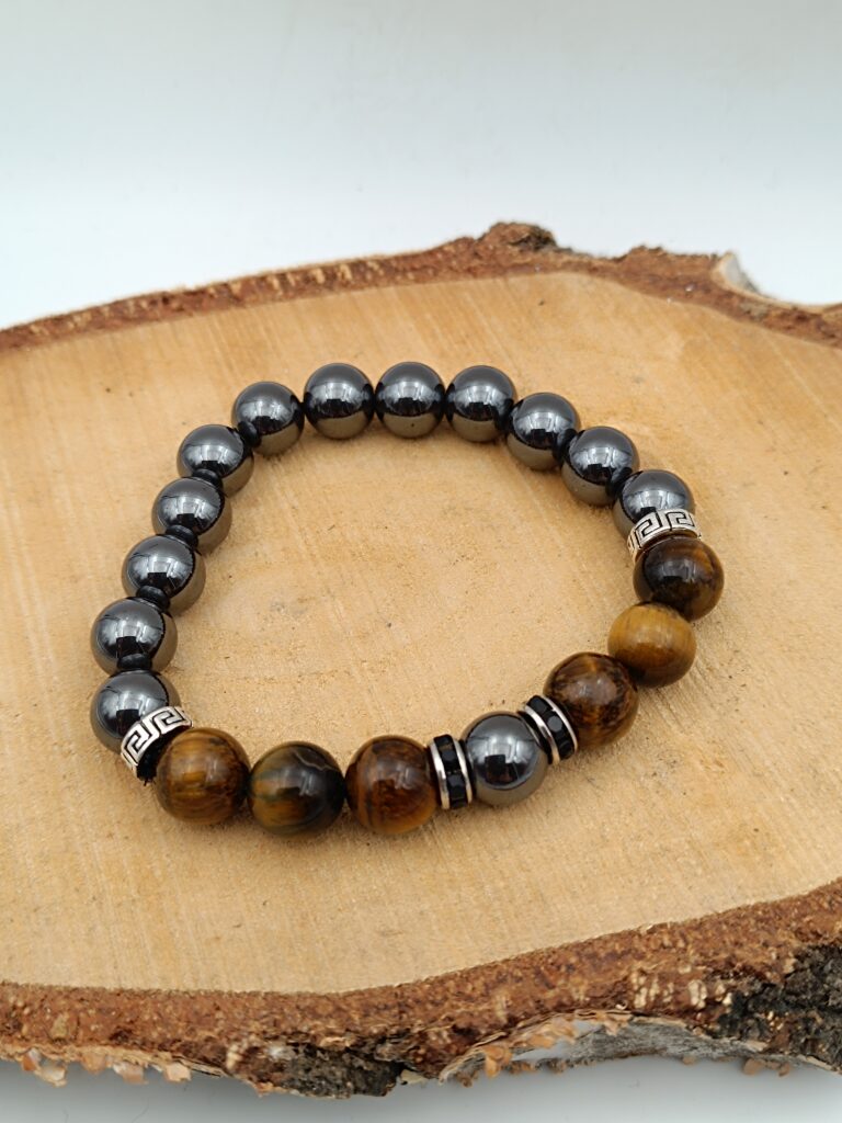 Descriptif du bracelet en Hématite, Œil de Tigre en pierres boules de 10 mm
