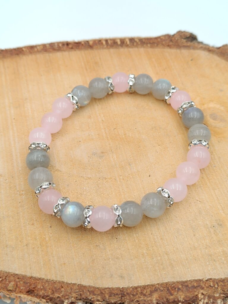Descriptif du bracelet spécial « Bien Être et Protection » en Labradorite et Quartz Rose en pierres boules de 8 mm