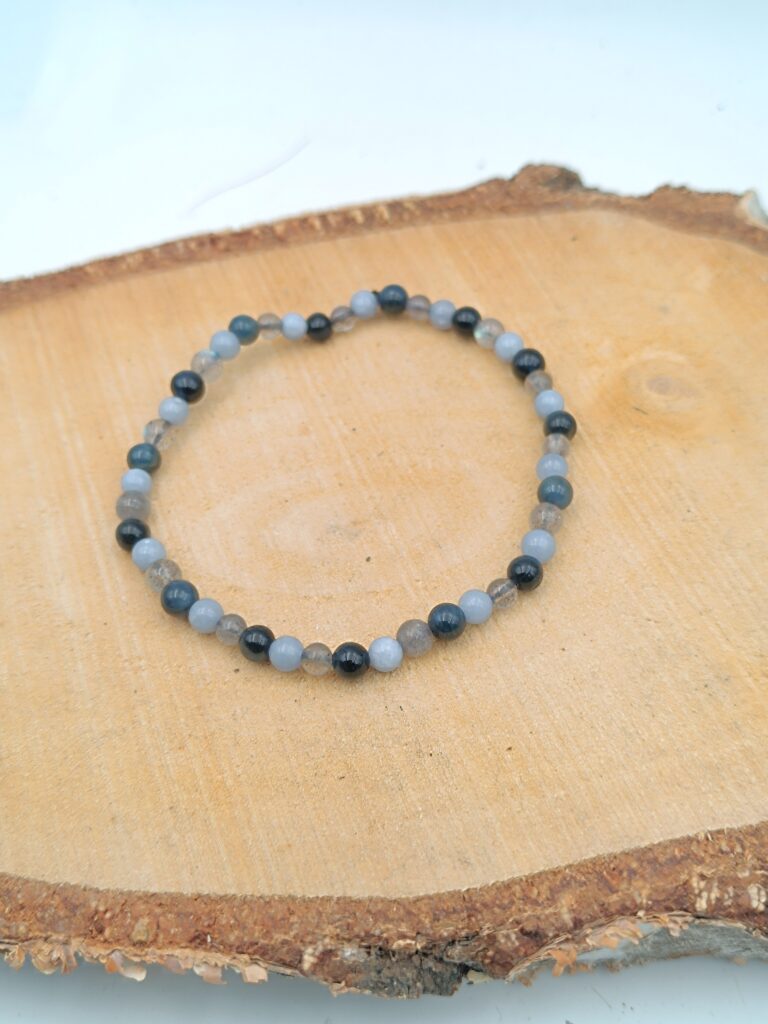 Bracelet en Spécial « Lâcher Prise » de 22 cm environ en pierres boules de 4 mm en Angélite, Labradorite et Œil de Faucon