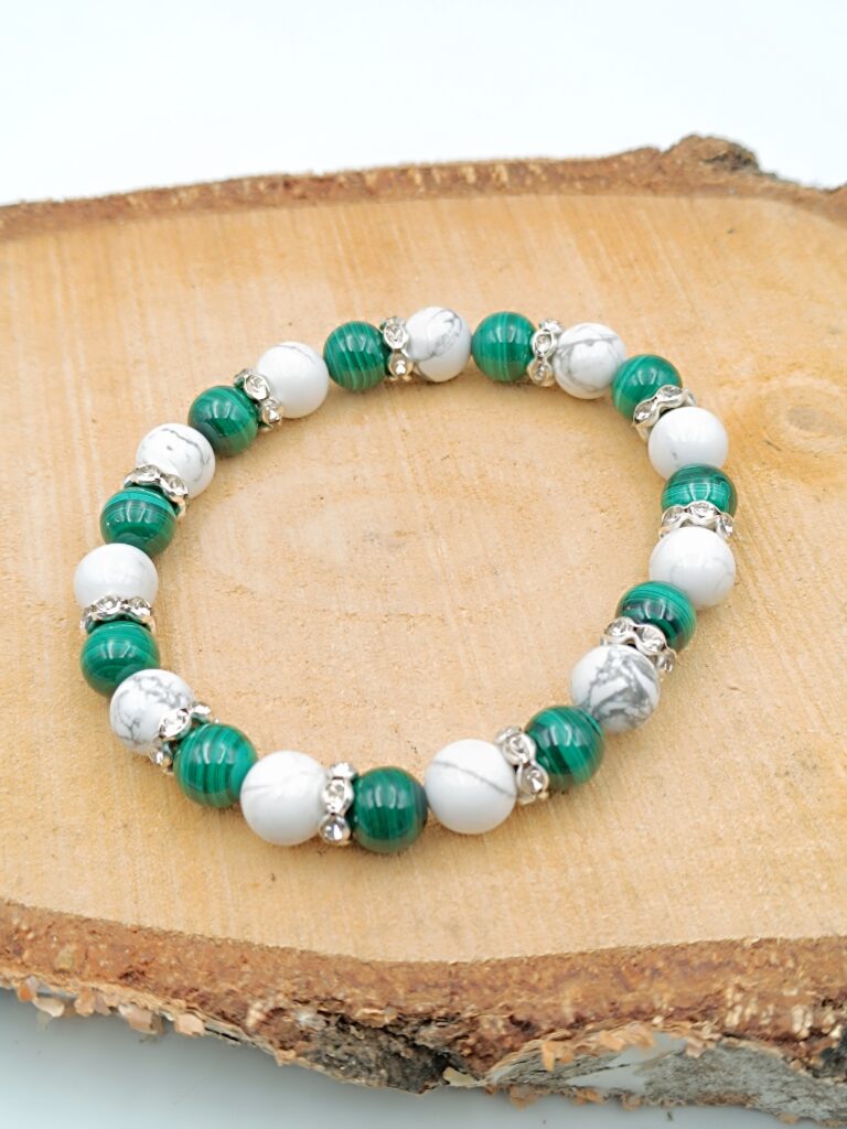 Descriptif du bracelet Spécial « Stress et Anxiété » en Howlite et Malachite en pierres boules de 8 mm